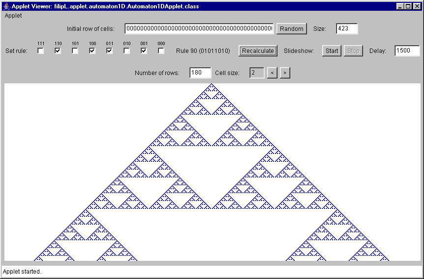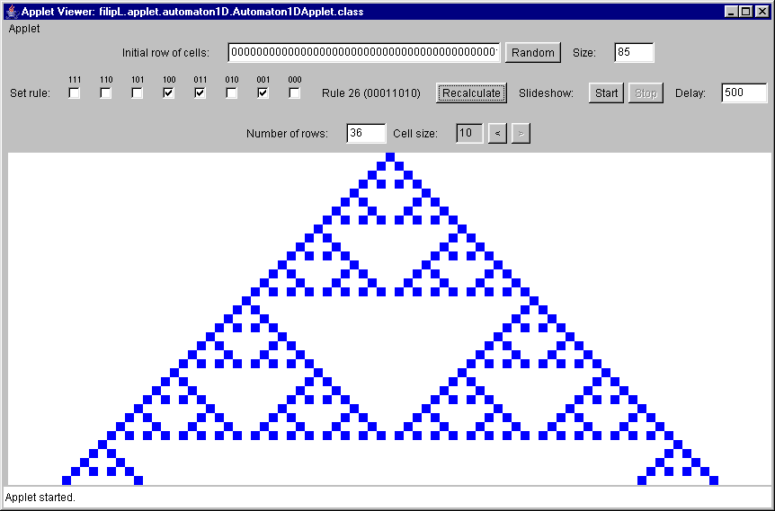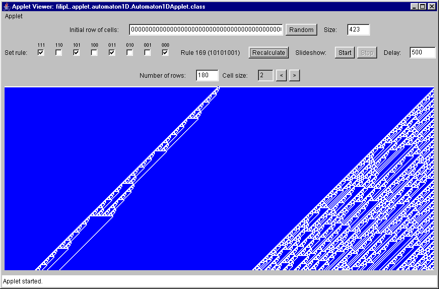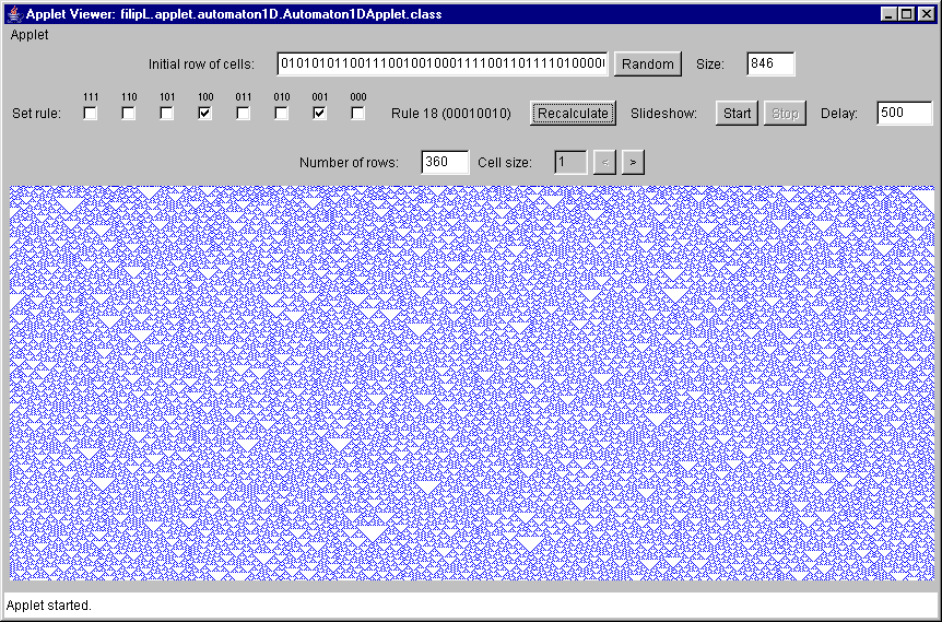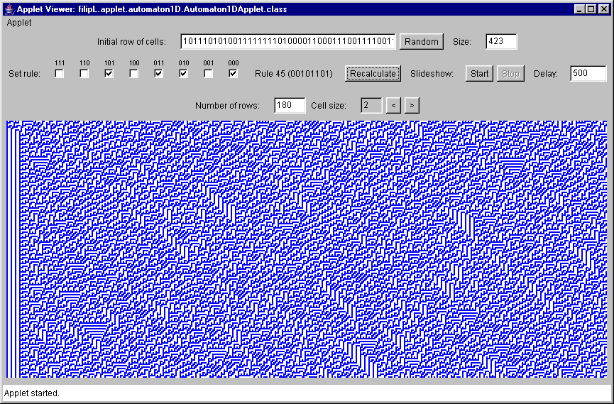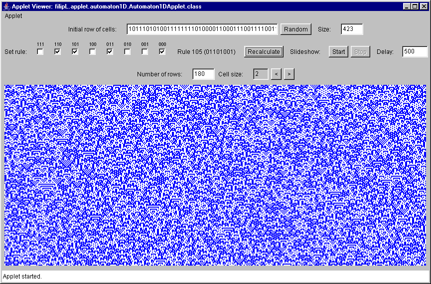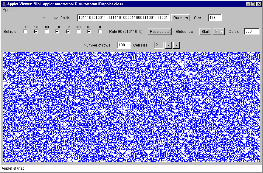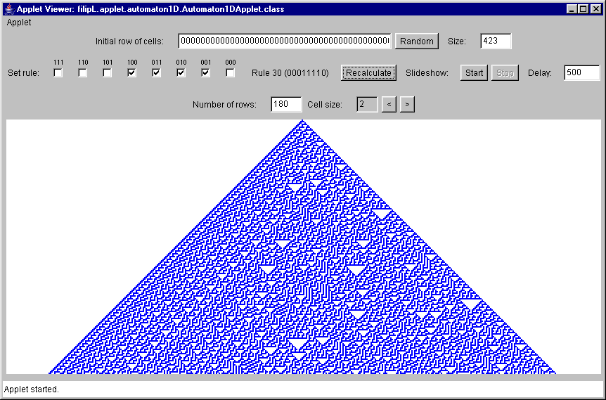 Initial row of cells (random): 101110101001111111101000011000111001111001101110101100100010111011010011010010000001001110000101010001000000011111111011011010010001110001010 110011111011111110011111101001111001010101010000111111110000001101100110110110100000101100000000100111000101111000001110111010001111000000101 001110111000000110101110010101010110000101010110000011110001000001101110000001101111010110001100101111010010010110001001010101111101011000111 |
